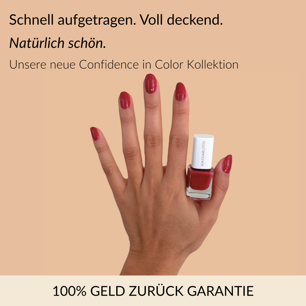 Unser Premium-Nagellack überzeugt durch langanhaltenden Glanz ohne Absplittern – je nach Alltag und Nagelpflege bis zu mehrere Tage zuverlässig.